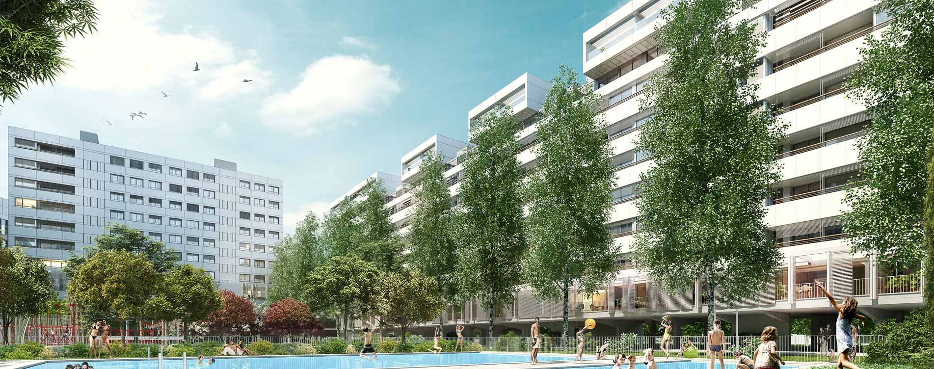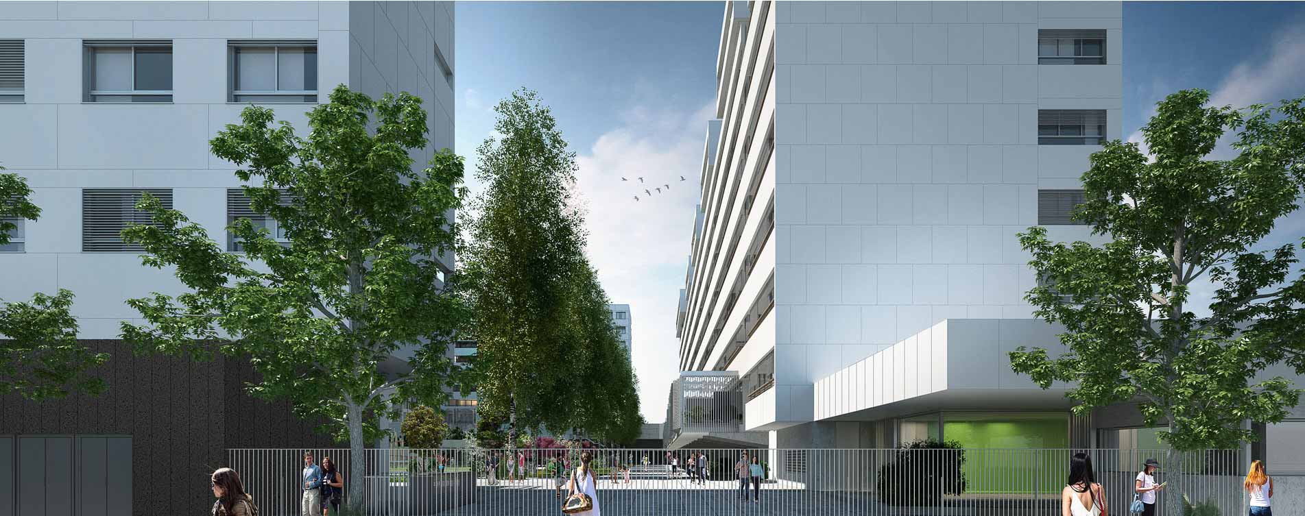 Los cuatro bloques no ocupan las esquinas de la parcela y evitan solaparse entre sí. Por ello, las vistas desde el gran jardín interior se prolongan hacia el exterior del conjunto en todas direcciones. La construcción destinada a usos terciarios queda fuera del ámbito de las viviendas, ocupando un área totalmente independiente y con accesos propios.